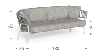 È stato osservando la luna che il suo designer ha avuto l'idea del divano da esterno a 2 posti Moon. Lo schienale ricorda la forma di una mezzaluna. La struttura è in alluminio rivestita da un intreccio di cordoncini in tessuto sintetico grigio. I cuscini sono realizzati in tessuto sfoderabile, facile da lavare e resistente alle intemperie. L'imbottitura è in schiuma ad asciugatura rapida.